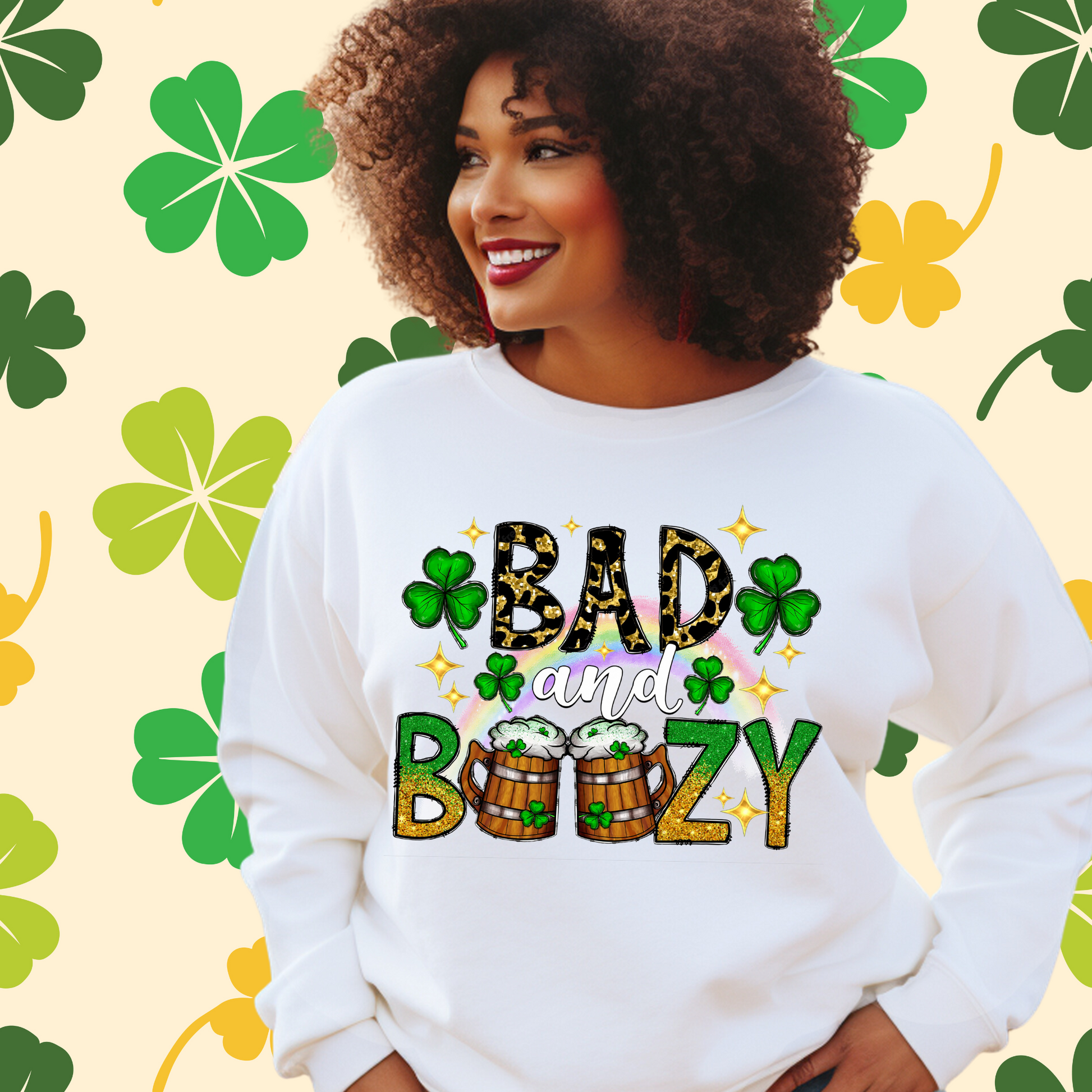 Unleash your festive spirit with our "Shamrock Shimmer apparel! This eye-catching design features bold, leopard print 'BAD' text with a glistening shamrock, and a glittery 'and DAZZY' text adorned with vibrant green clovers. The centerpiece is a radiant, multi-colored rainbow arching between two frothy mugs of golden brew, signifying good times and cheer.