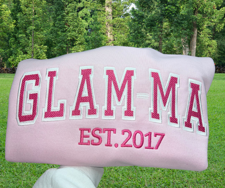 This eye-catching sweatshirt is a perfect blend of comfort and pride, making it an ideal gift for any mom. The front boasts a bold declaration of 'Glam-ma EST. date, signifying the year she embarked on her motherhood journey. The letters are emblazoned in a sparkling black glitter that catches the light, adding a touch of glamour to the garment.