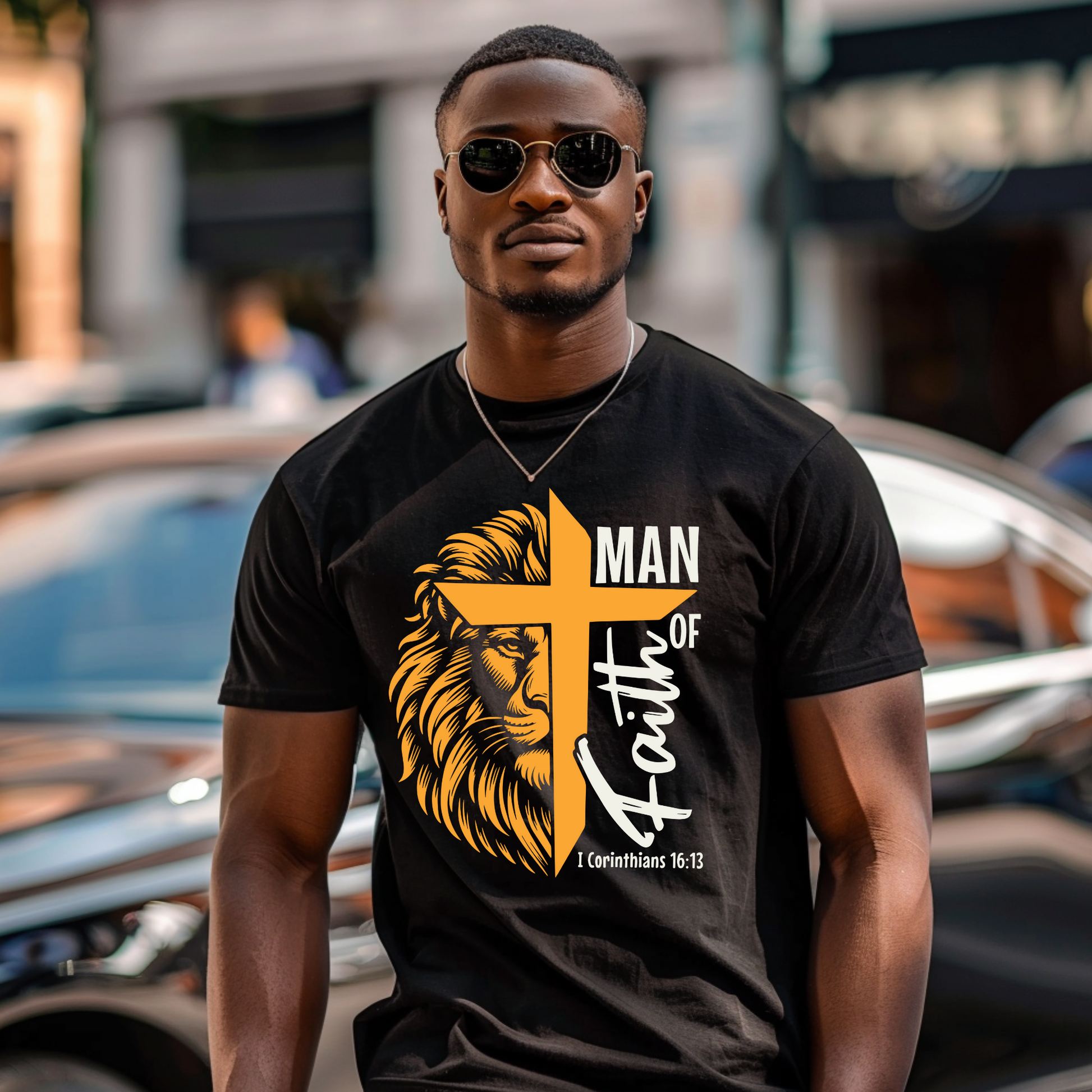 his "Man of Faith" t-shirt is a powerful symbol of strength and belief, seamlessly blending spiritual imagery with modern design. At the center is a striking white graphic of a lion's mane merging into a cross, symbolizing courage and conviction. Encircling this is the bold declaration "MAN OF FAITH," which resonates with individuals who carry their spirituality as a badge of honor.