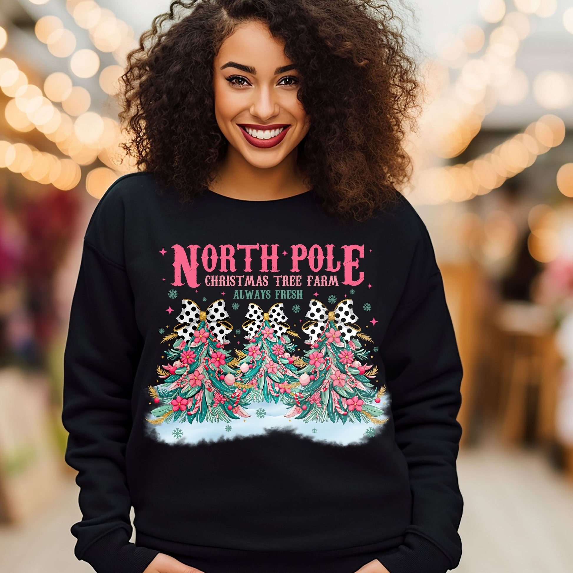 Stay warm and festive this holiday season with our North Pole Frosted Trees Christmas sweatshirt. With a frosty design inspired by the winter wonderland of the North Pole, this sweatshirt is perfect for spreading holiday cheer. Made with high-quality materials, it's both cozy and stylish for all your winter festivities.